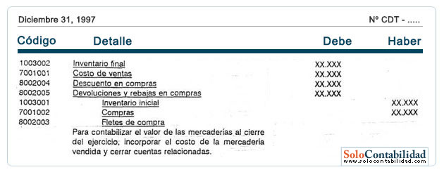 Este registro se denomina asiento de ajuste y cierre. Asiento de ajuste por que se incorpora el Inventario final y se cuantifica el Costo de ventas y asiento de cierre por que saldarán las cuentas del Inventario inicial y Compras.