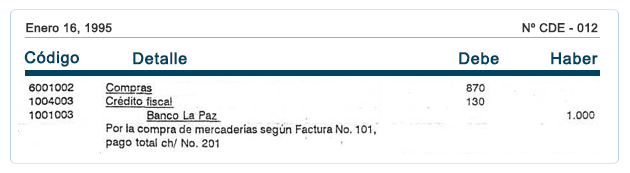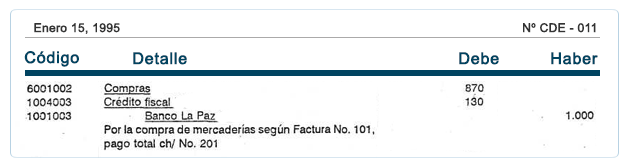 15 de enero de 1995.- Se efectúa la compra de mercaderías según Factura No 101 por $ 1.000.00, cancelando la totalidad con cheque No 201 del Banco La Paz.