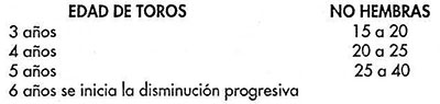 Además que en la formación de hatos de ganado vacuno, se tienen que tomar en cuenta que a toros jóvenes no se los puede asignar un gran número de hembras, porque el agotamiento puede disminuir su vida útil. A la vez que toros viejos de mayor edad tienen menos posibilidades de fecundación, por la extenuación del sistema reproductor.