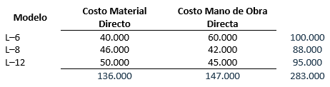 a) Distribuir los costos comunes de fabricación sobre la base del costo de la materia prima y preparar una tabla que muestre, para cada uno de los modelos, la estructura de costos, la ganancia bruta y el precio de venta, suponiendo que la ganancia bruta sobre el costo de producción para cada modelo es: L–6 el 20%, L–8 el 30% y L–12 el 25%.