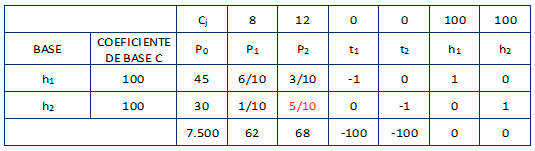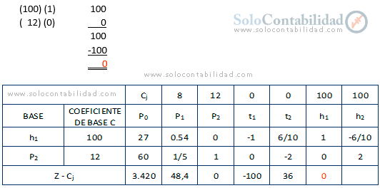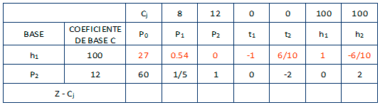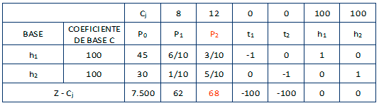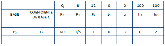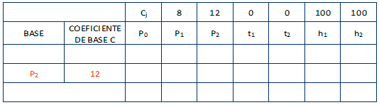 c) Se elige el de menor cociente, en este caso corresponde a h2, por tanto, sale de la base h2 y entra P2 con su coeficiente base 12.
