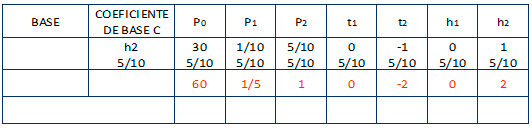 Para que el pivote 5/10 que se encuentra en la intersección de la columna P2 y fila h2 sea 1, se divide entre 5/10 o lo que es lo mismo se multiplica por 10/5.