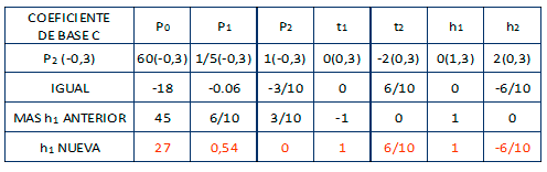 Para ello ya se ha cumplido con el 1, aún falta convertir en 0 la intersección de la columna P2 y fila h1; para lo cual se multiplica toda la nueva fila de P2 por -3/10 y se suma a la fila h1 anterior, cuyo resultado será la nueva fila h1