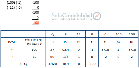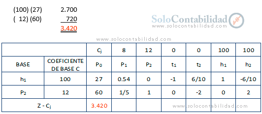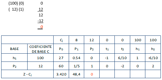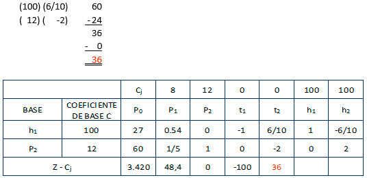 j) El valor de la última fila y columna P2 es la sumatoria de los productos de las columnas C y P2 a cuyo resultado se le resta 12 que es el correspondiente Cj de P2.