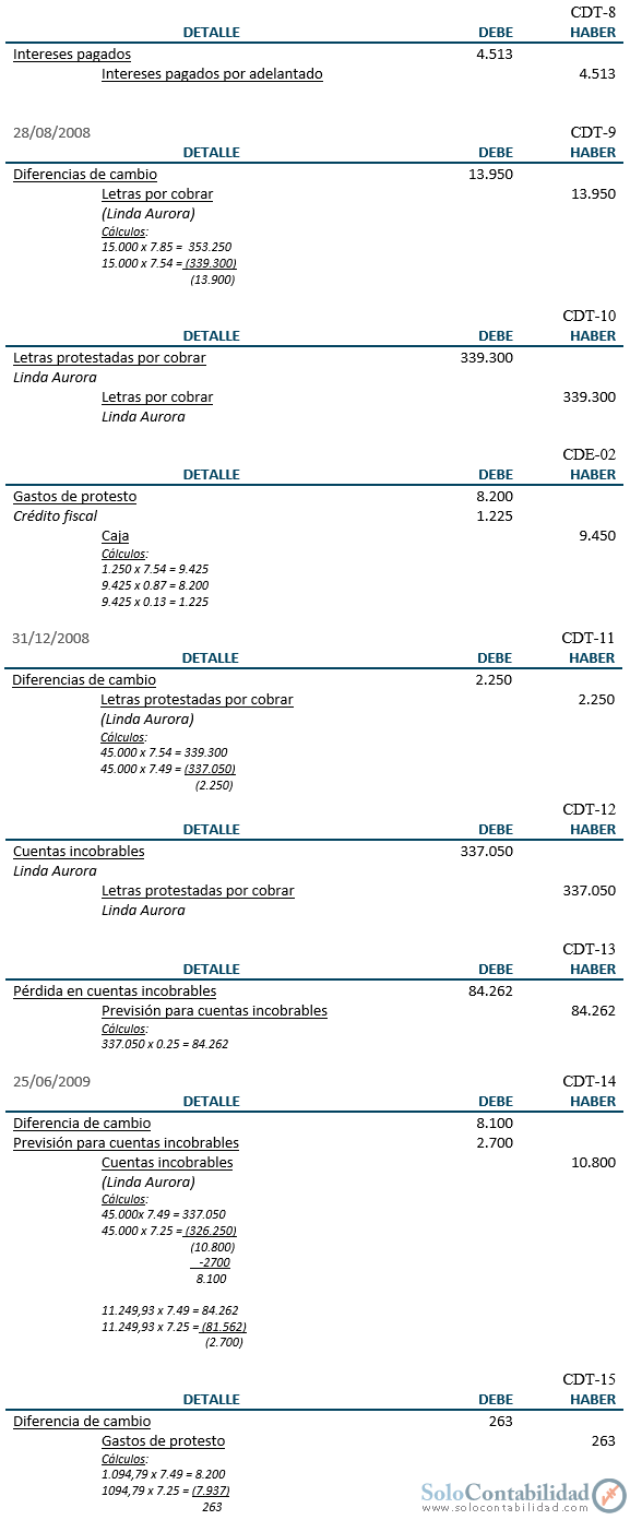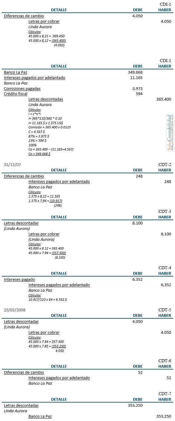 25 de octubre de 2007. ($ 8.12) Almacenes “Rosita” procede a descontar la letra de cambio Nº 789 suscrita por Linda Aurora en fecha 16 de septiembre de 2007 por US$ 45.000.00 a 150 días plazo, en el Banco La Paz, con interés del 10% anual y una comisión del 1.25% según factura Nº 456.