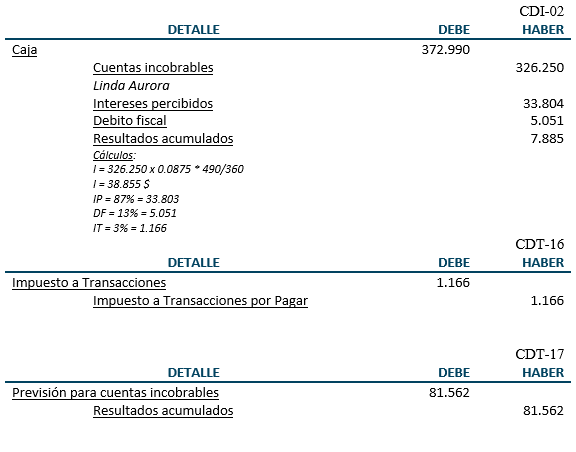 25 de junio de 2009. ($ 7.25) Linda Aurora cancela a la empresa el valor de su letra de cambio suscrita el 16 de septiembre de 2007, más gastos inherentes al proceso judicial. Además, se le recarga el 8.75% de interés anual, razón por la cual se emite factura Nº 123.