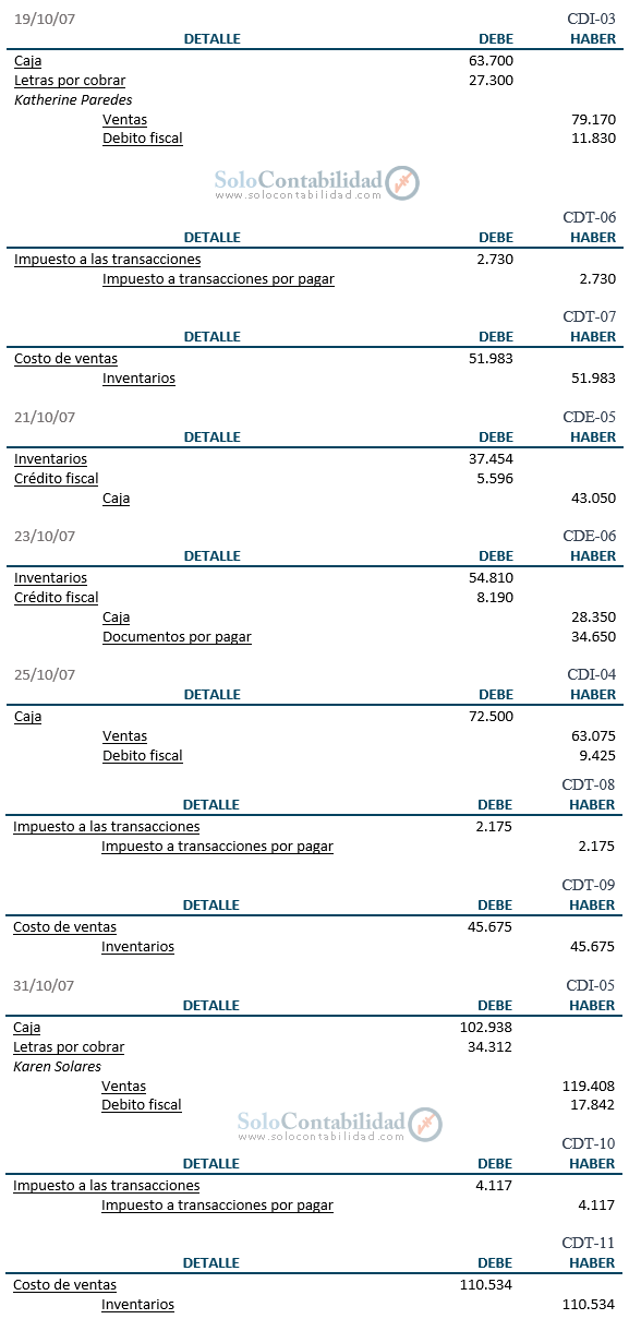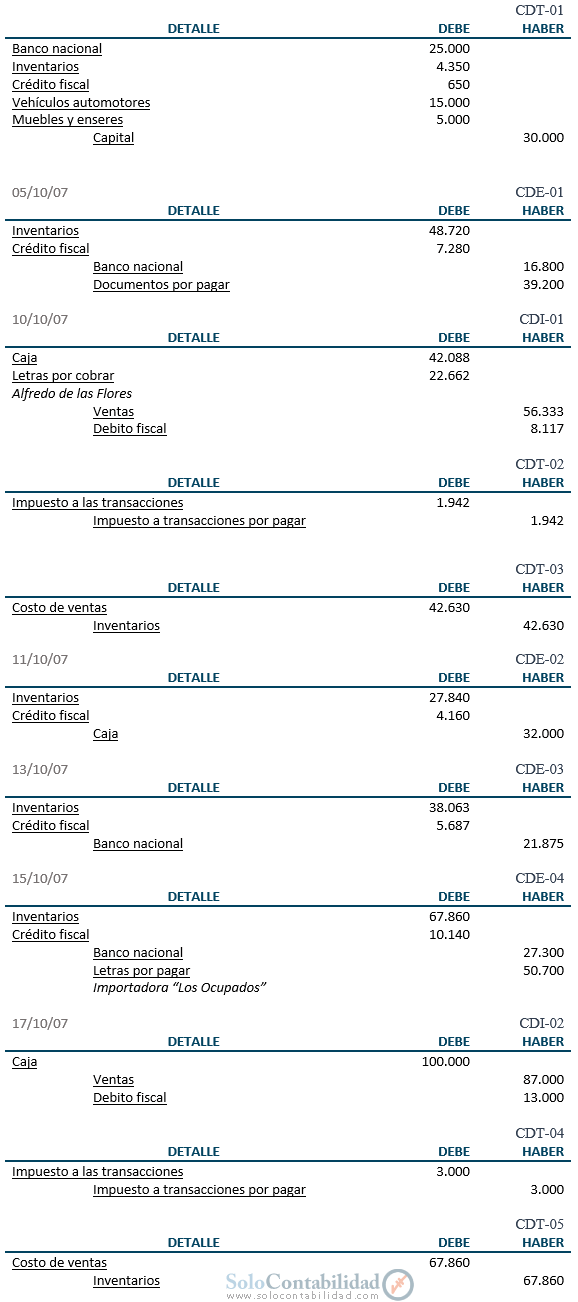 13 de octubre de 2007: Se compran 250 unidades de radios AKITA cada uno a $ 175, según factura N° 456 de Importadora “Los Descarados”, cancelándose el 50% con cheque Nº 101 de Banco Nacional y por el saldo se suscribe una letra de cambio a 30 días plazo.