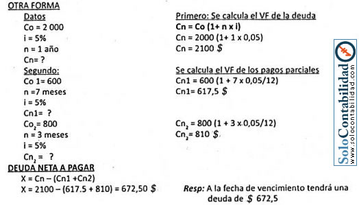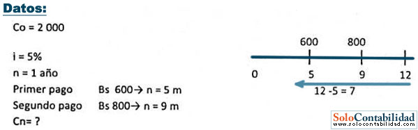 Ejemplo 34: Una deuda de $ 2000 con interés del 5% vence en un año. El deudor paga $ 600 en 5 meses y $ 800 en 9 meses. Hallar el saldo de la deuda en la fecha de vencimiento.