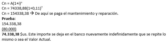 Ejemplo 4.- El puente de las Américas se ha construido por un costo el bien $US 3.000.000 los ingenieros estiman que cada 7 años deben efectuarse trabajos de mantenimiento y reparo cuyo costo asciende a $US 80.000. Encontrar el valor actual de un número grande de operaciones que se requieren hacer en el puente, es decir el dinero equivalente el día de hoy para poder disponer en forma indefinida $US 80.000 cada 7 años (al 11%).